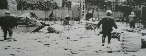 圖-8 施工時(shí)采用篷布擋風(fēng) 圖-9 施工后采用外掛麻袋
